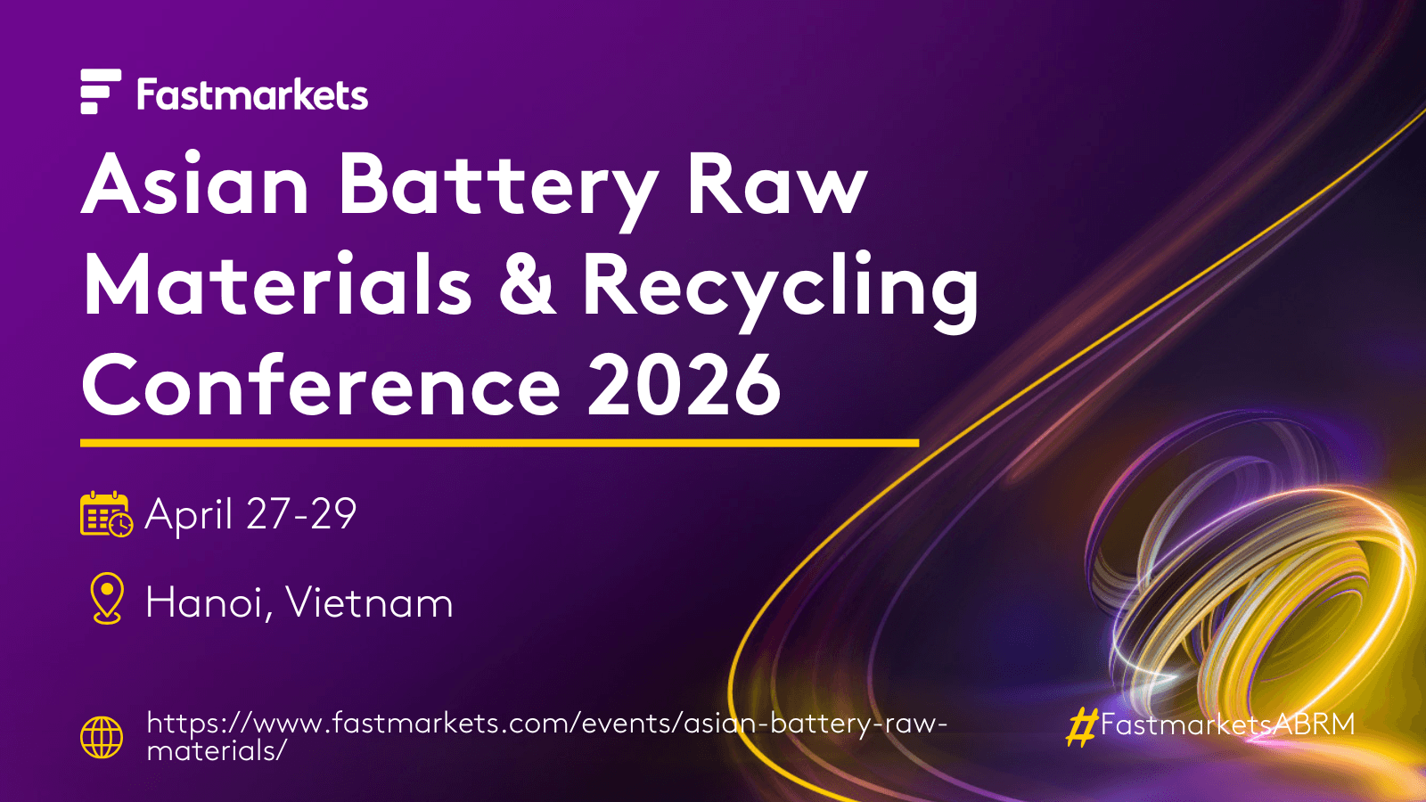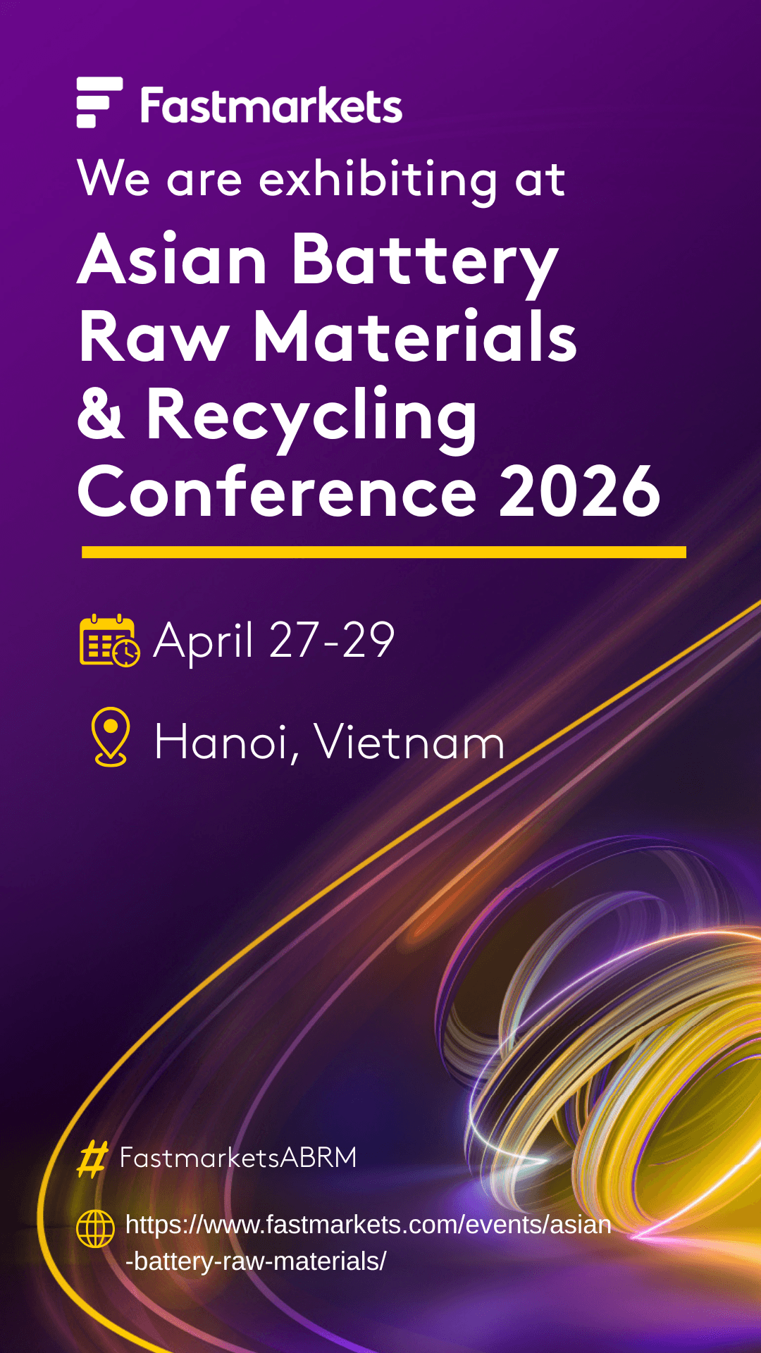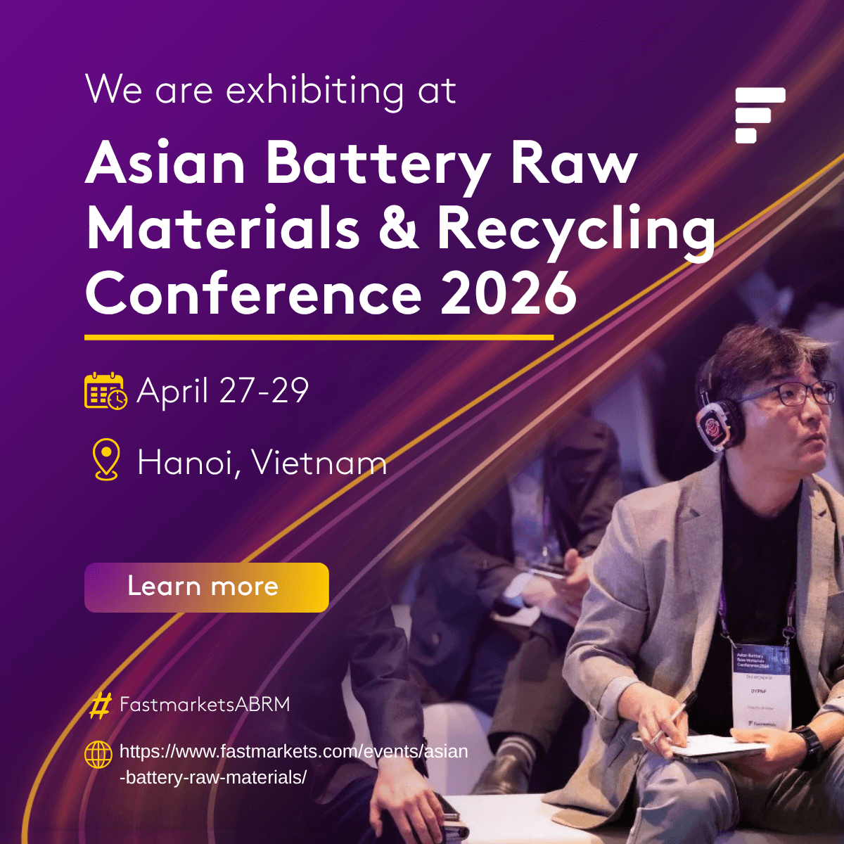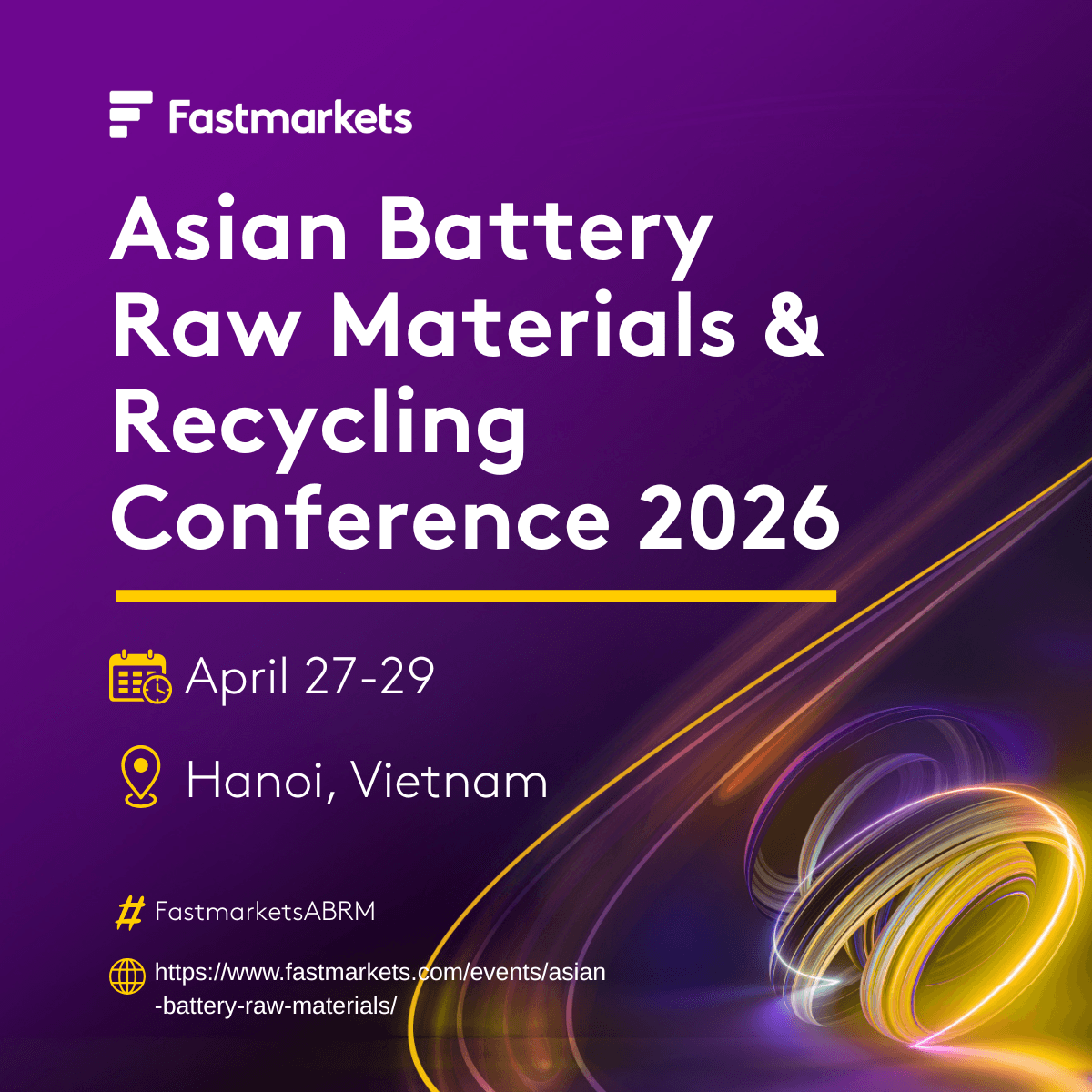 We’re heading to Hanoi! [Company Name] will be exhibiting at the Fastmarkets Asian Battery Raw Materials & Recycling Conference 2026. We look forward to seeing you there! #FastmarketsABRM