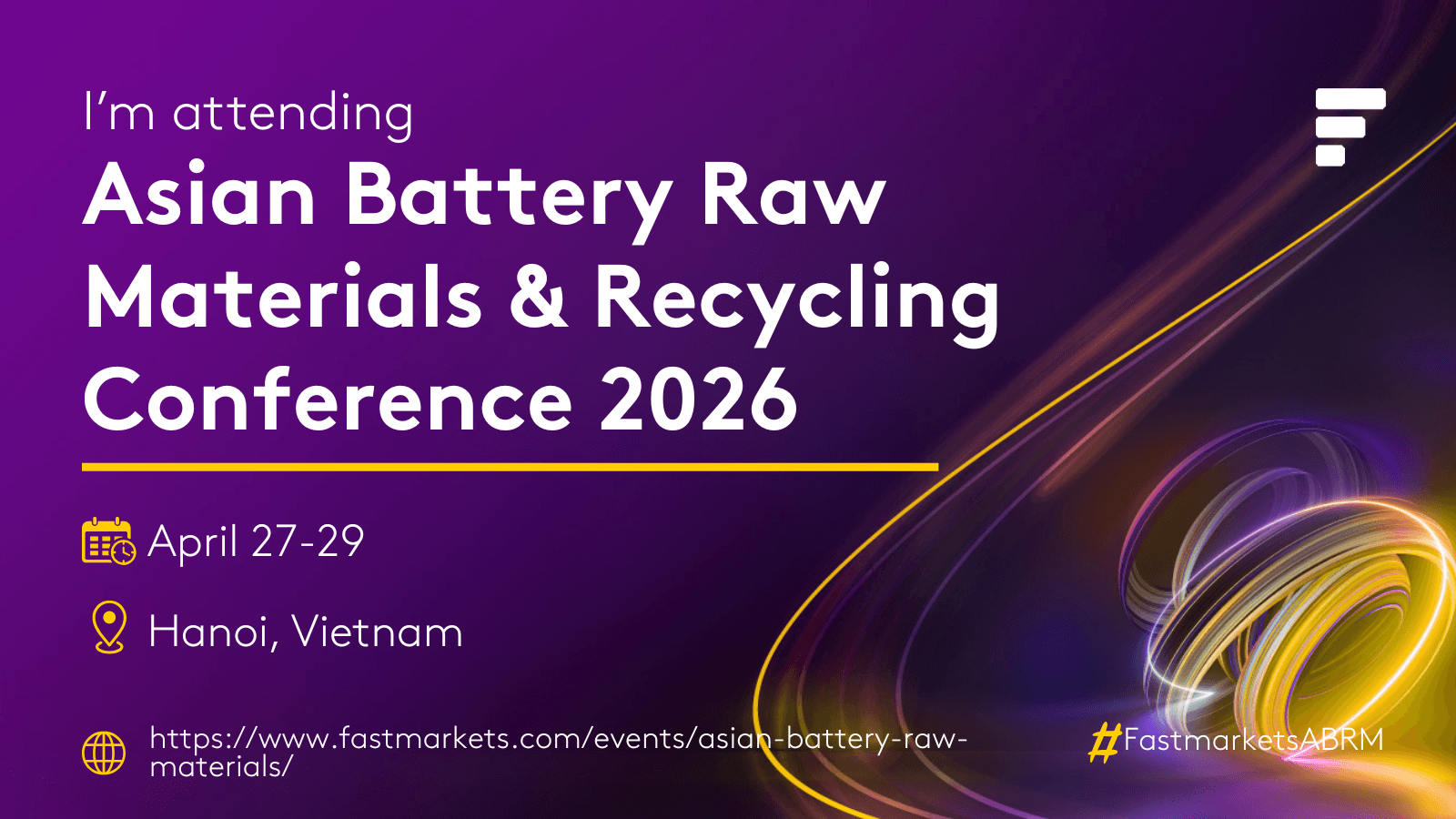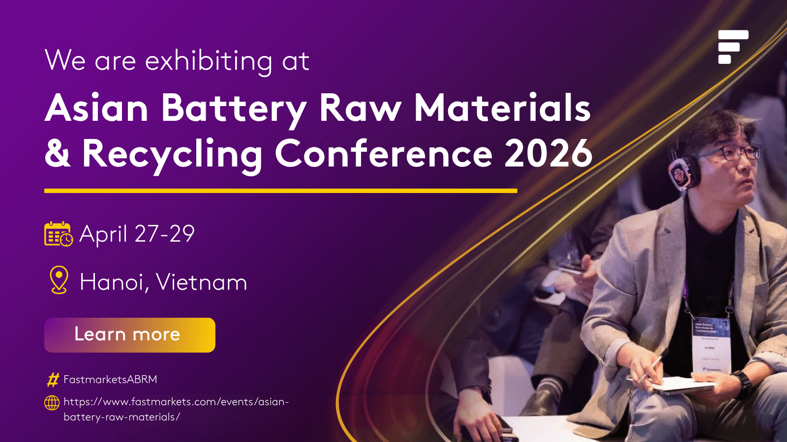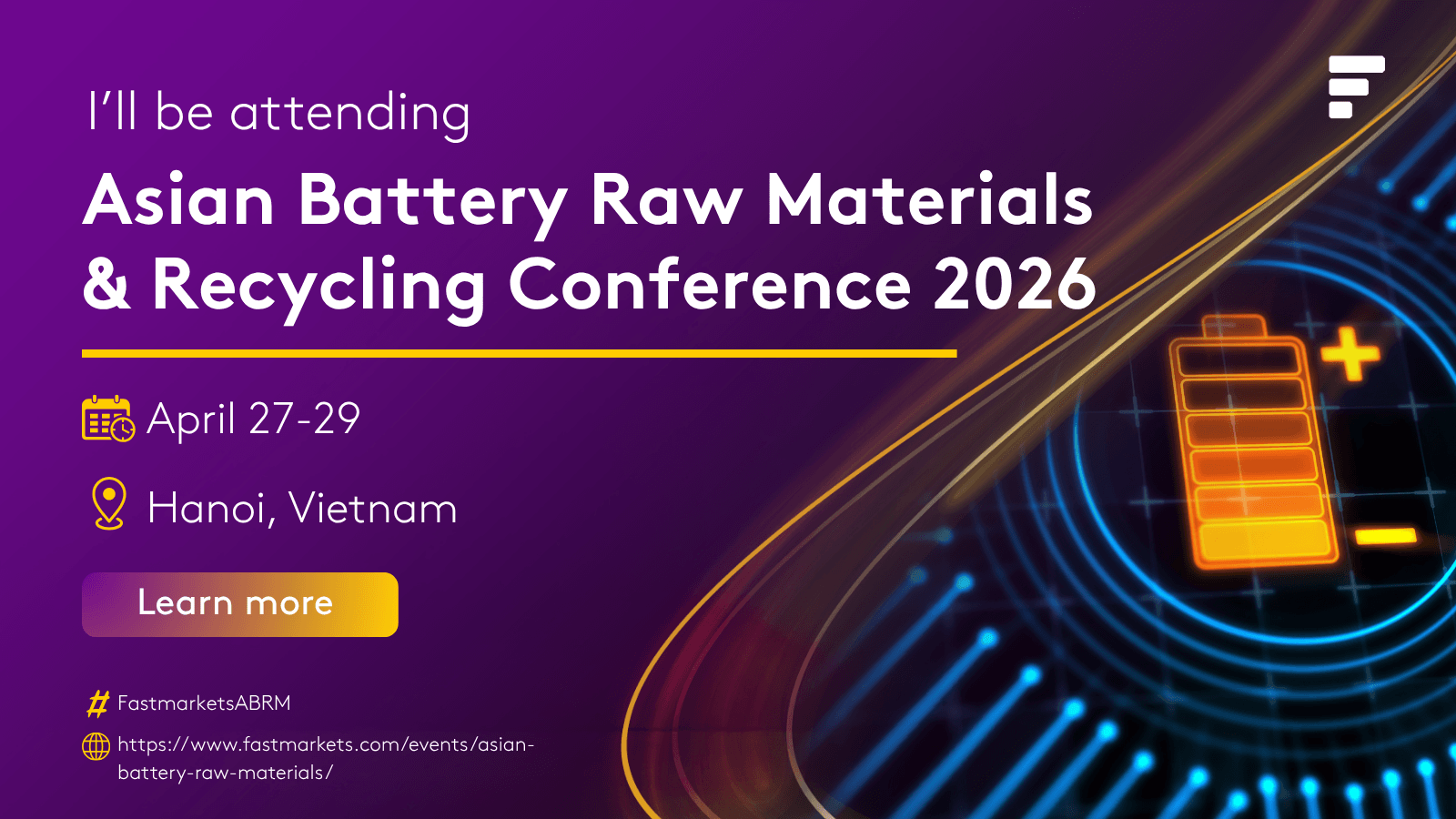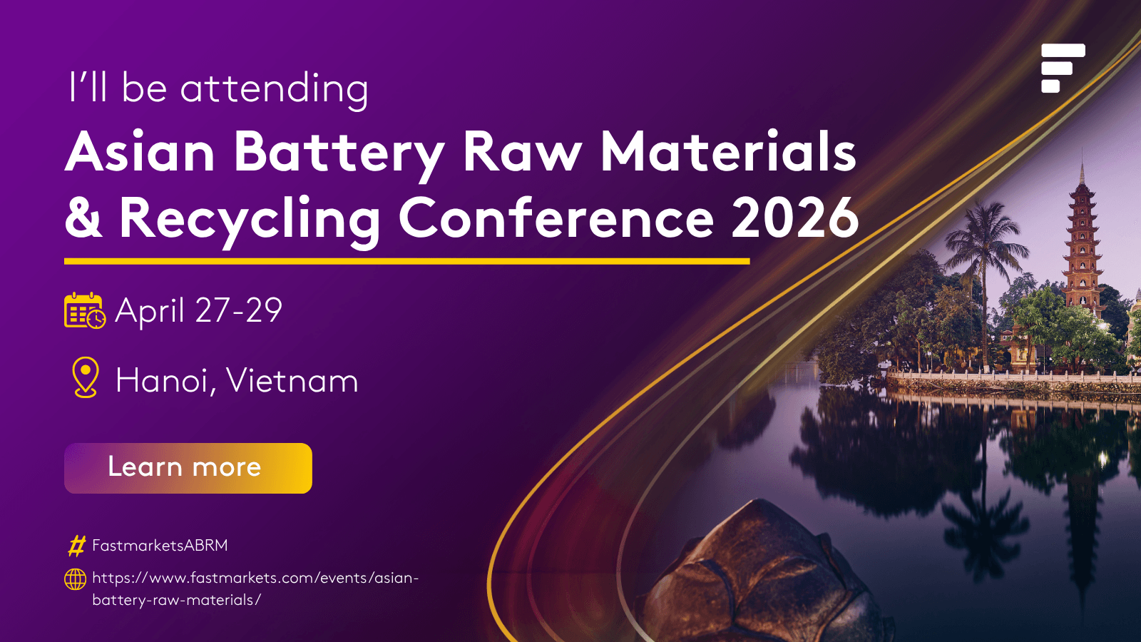 We’re heading to Hanoi! [Company Name] will be exhibiting at the Fastmarkets Asian Battery Raw Materials & Recycling Conference 2026. We look forward to seeing you there! #FastmarketsABRM