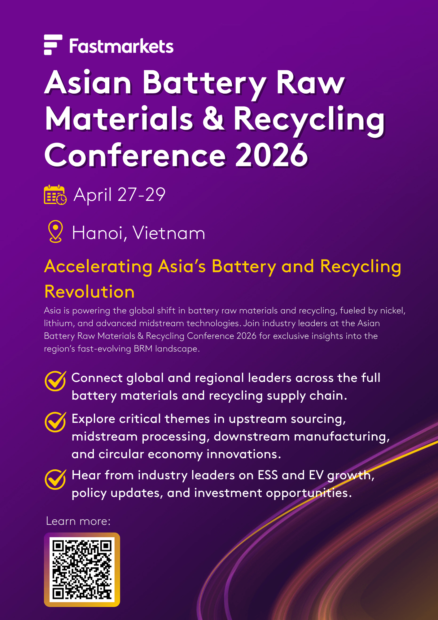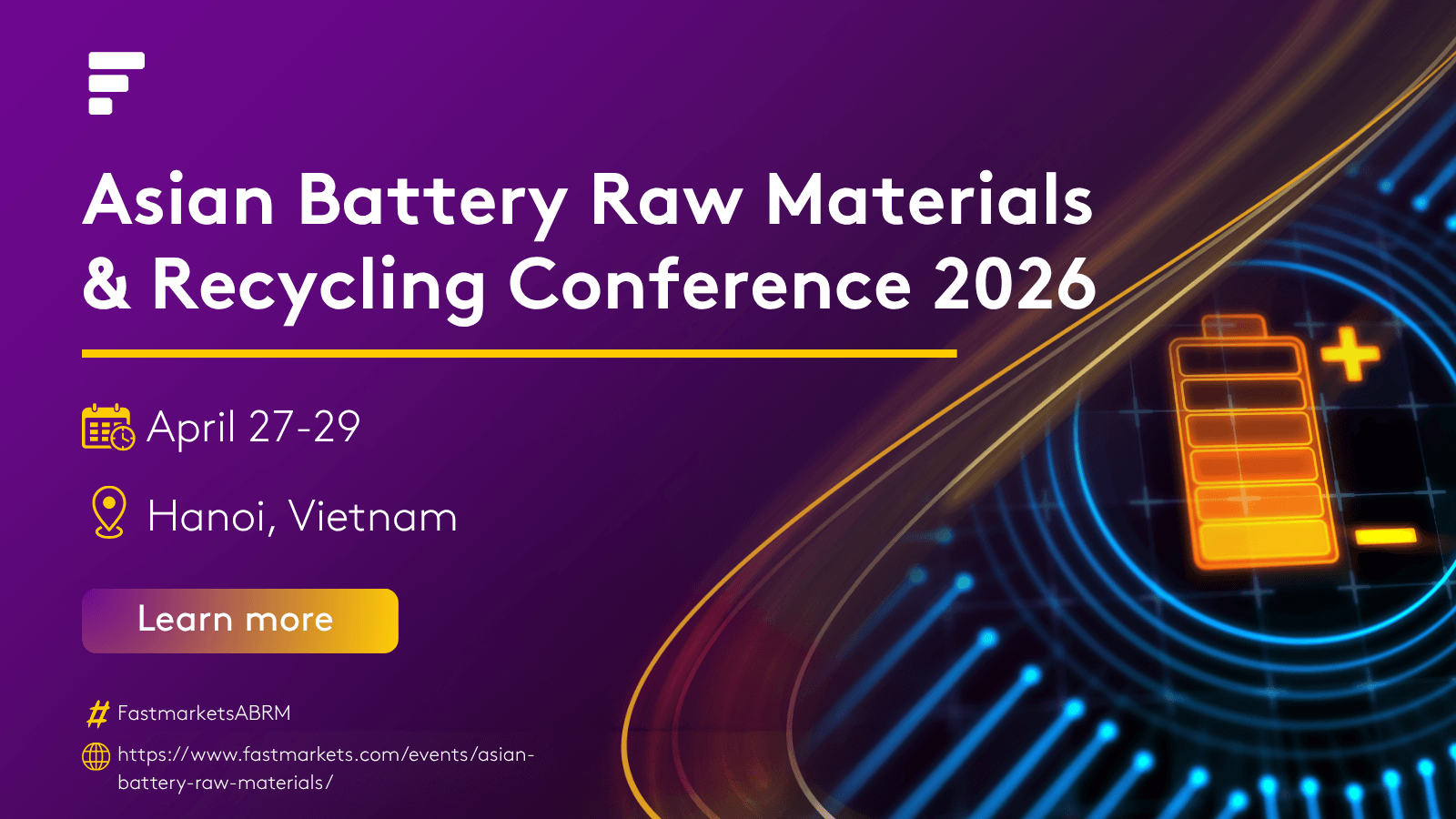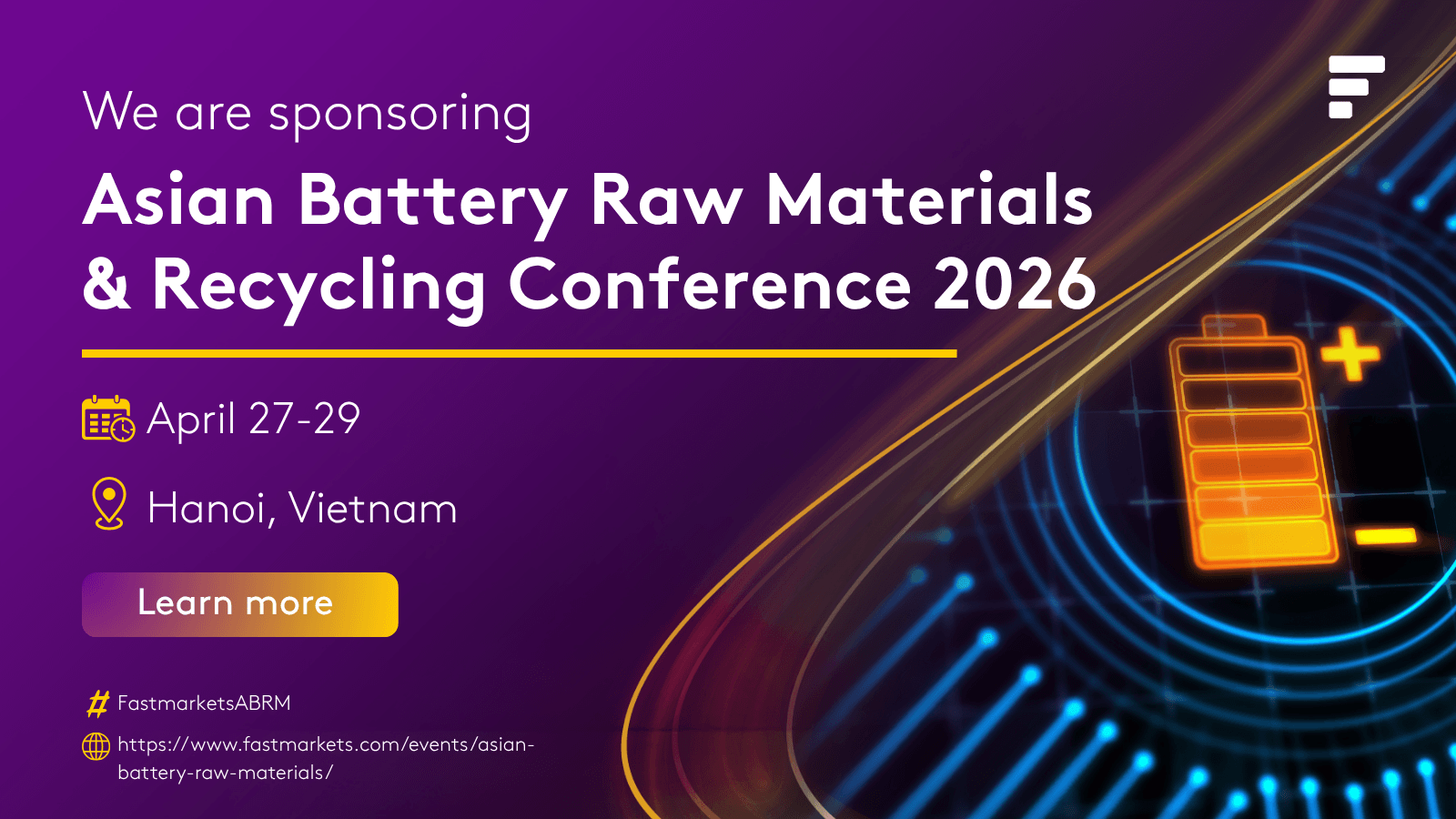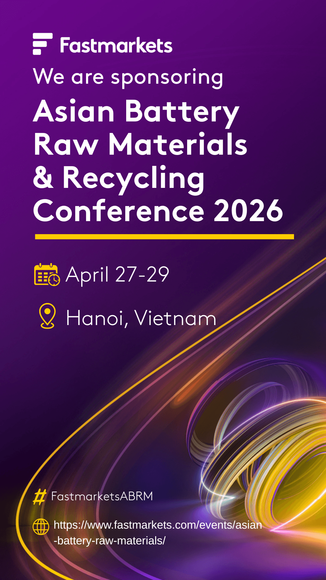 We’re heading to Hanoi! [Company Name] will be exhibiting at the Fastmarkets Asian Battery Raw Materials & Recycling Conference 2026. We look forward to seeing you there! #FastmarketsABRM
