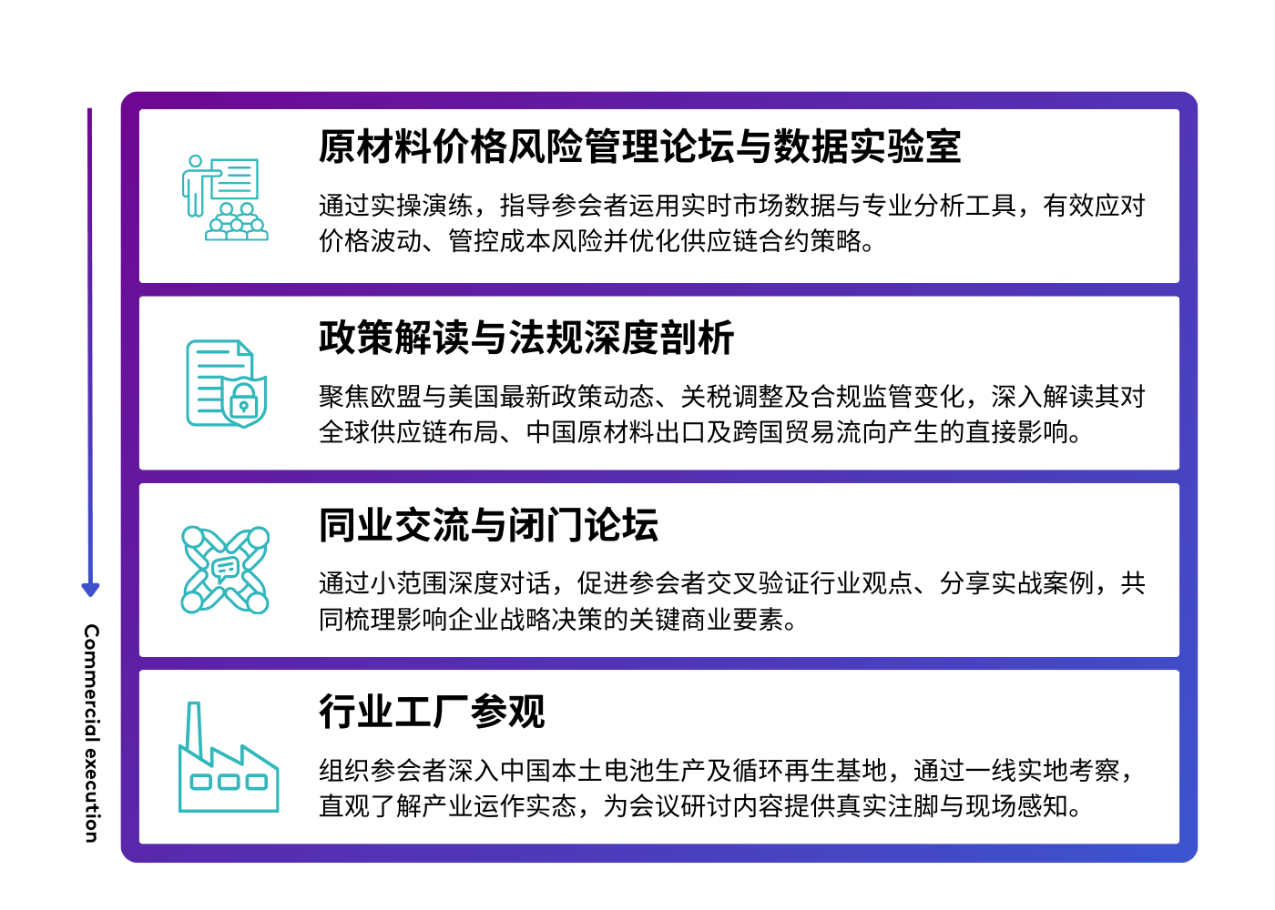 随着政策不确定性加剧、电动汽车与电池需求持续演变,风险管理正成为电池价值链各环节的核心商业能力。本论坛将为您提供关键洞察与实用工具,帮助您管理价格风险并为2026年及之后的决策提供依据。