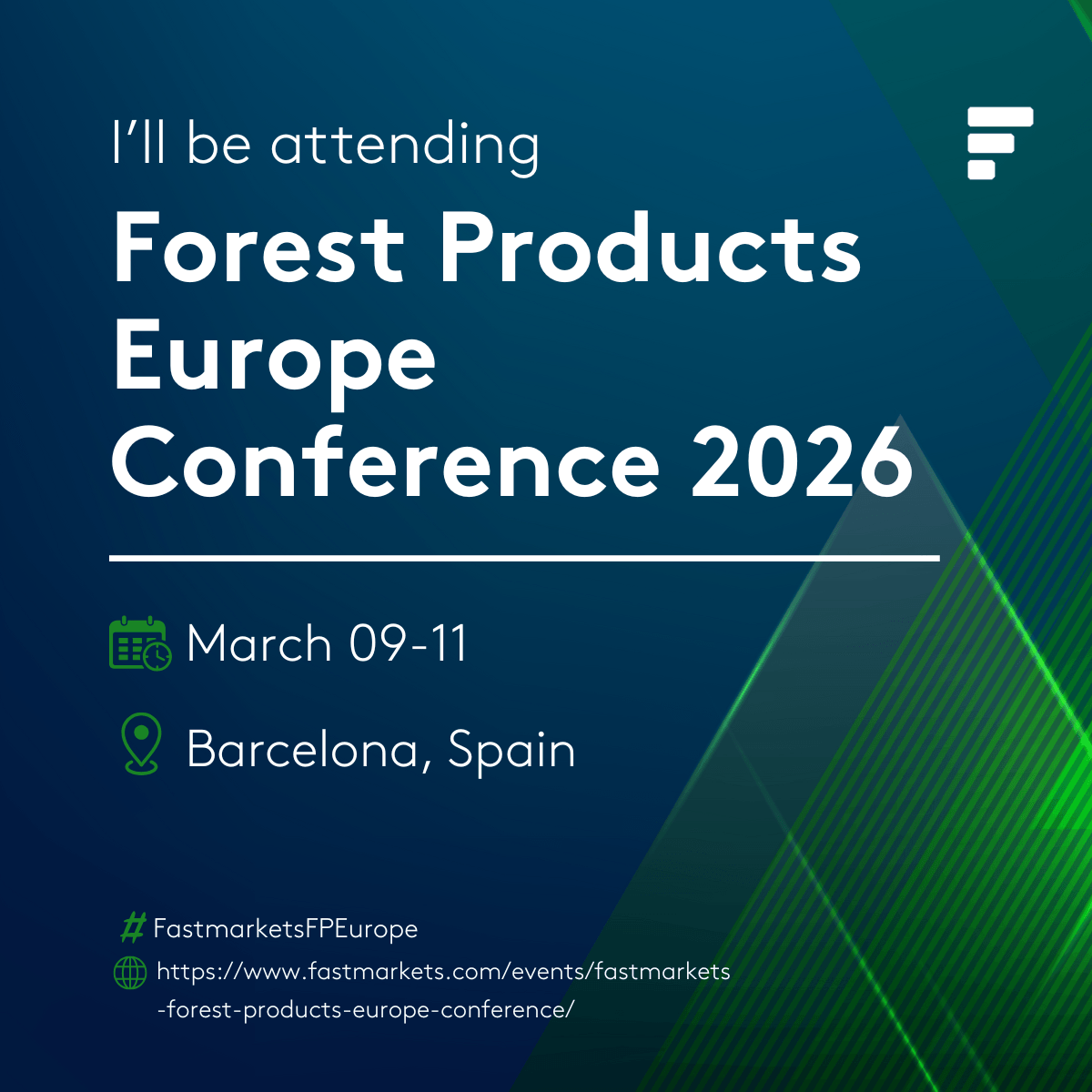 Use the assets below to post about your upcoming attendance at the Forest Products Europe Conference 2026. Feel free to use the suggested copy or create your own. Make sure to use the official event hashtags: #FastmarketsFPEurope.