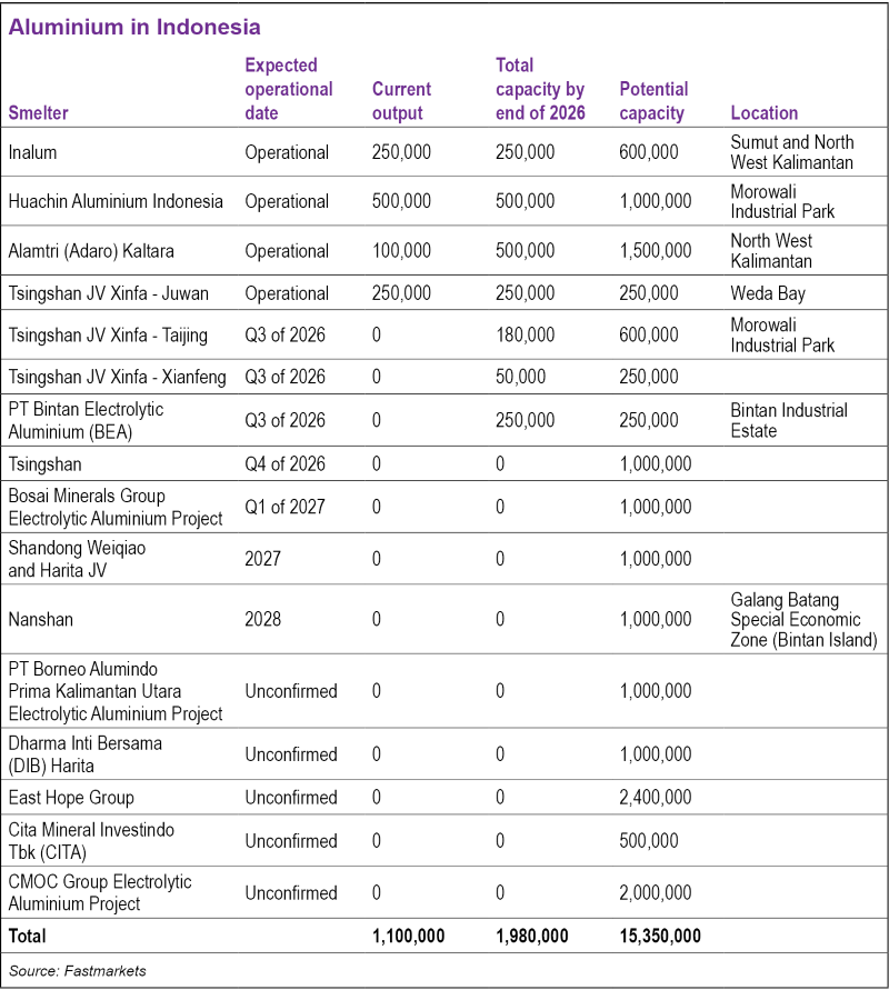 The $3 billion smelter would be the latest addition to aluminium production in Indonesia, where output is currently expected to reach 1.98 million tonnes per year by the end of 2026, according to Fastmarkets analysts.A source told Fastmarkets said that while it was too soon to say exactly when construction might start, “an optimistic estimate is that production will begin in two years.”