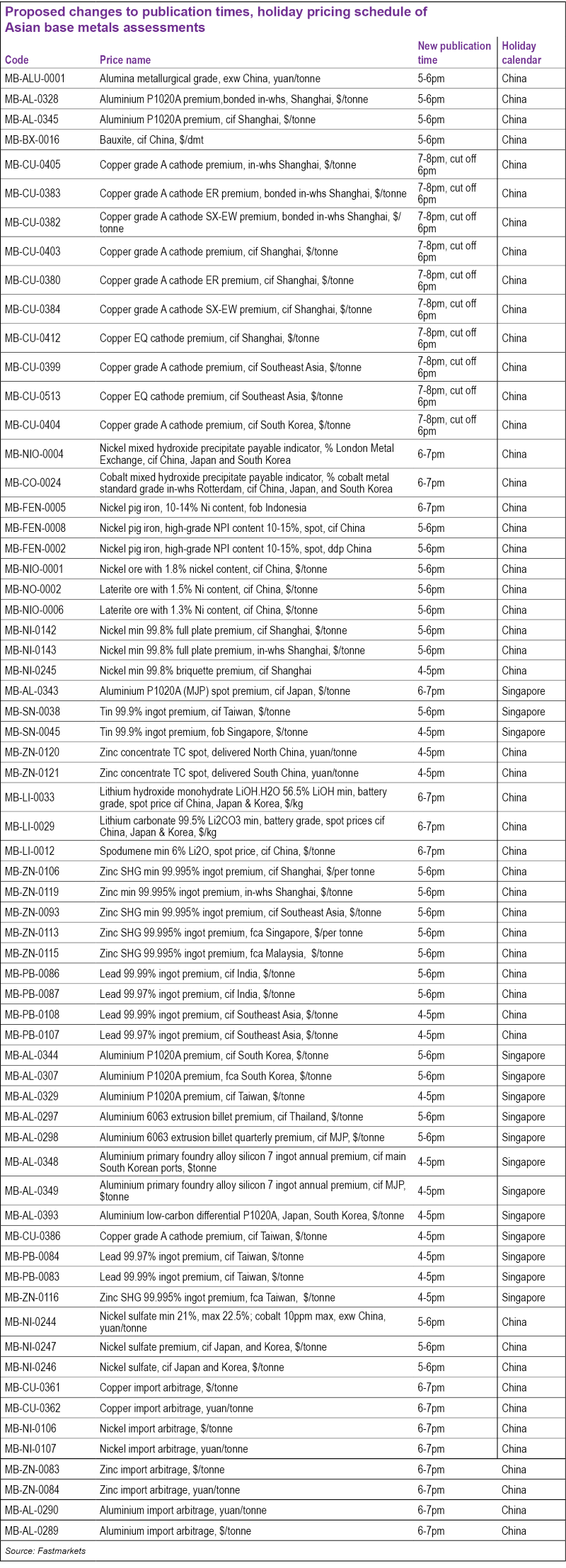 The assessments, which currently follow the UK holiday calendar and are published in UK working hours, will follow the China or Singapore holiday calendars and will be published in China or Singapore working hours after the proposed change.Additionally, Fastmarkets will add cut-off times for accepting data submission for several copper assessments.The purpose of the adjustment is to align the timing to the activity in the relevant markets and ensure that subscribers receive timely and accurate pricing information.The assessments affected, as well as the new publication times and holiday calendars, are shown in the table: