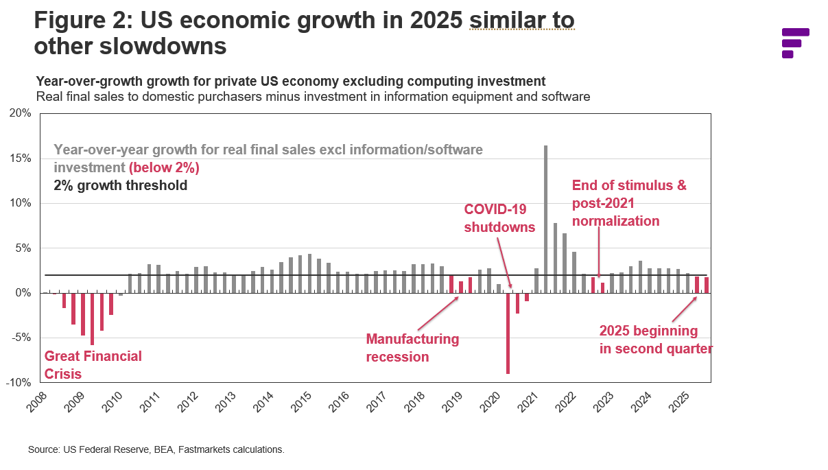 In the first quarter of 2025, prior to Liberation Day, year-over-year growth was still reasonably healthy, but it fell below 2% in the second and third quarters. This was the worst performance since 2022, when the economy was still cooling back to trend after the 2021 rebound. Besides 2022 and 2025, the only other quarters since 2007 with growth below 2% were the Great Financial Crisis, late 2018 and early 2019 (when US manufacturing and corrugated box demand were in recession) and 2020. Corrugated box shipments declined during all of these periods, and it is more than a little difficult to view the performance of the US economy in 2025 as truly healthy rather than merely propped up by the wave of AI investment.