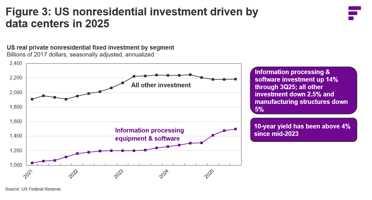 A major factor in the healthy performance of the US domestic economy in recent quarters has been the massive wave of investment in artificial intelligence (AI). Real final sales to private domestic purchasers have done slightly better than headline GDP in 2025, rising by 2.7% through the third quarter. However, an increasing share of this growth has been driven by investment in information processing equipment & software. This sector accounted for less than 10% of the growth in real final sales to private domestic purchasers in 2023-24 and a whopping 33% in the first three quarters of 2025. Data center investment has accelerated to a record rate since the explosion of interest in AI and its ascendance has disguised the slowdown in year-over-year growth rates for the rest of the US economy, depicted by the purple bars in Figure 1.