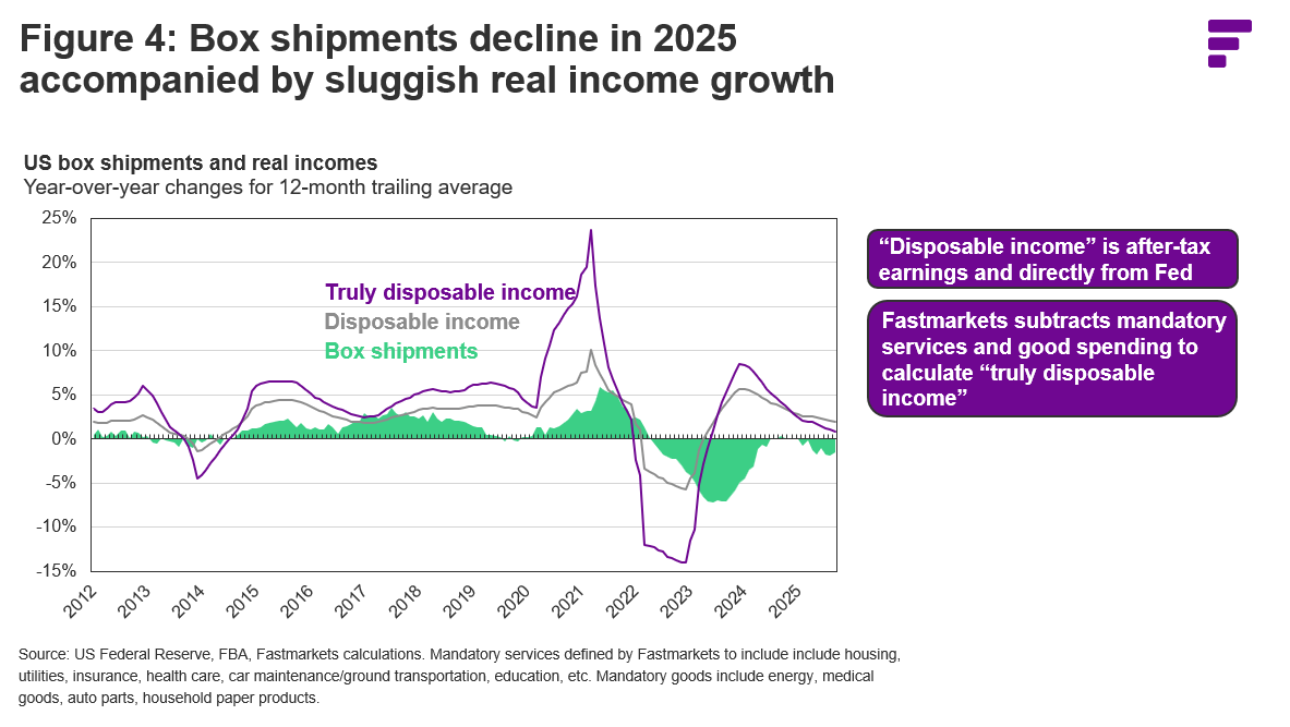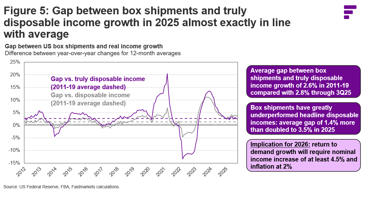 pandemic performance for truly disposable income growth, its long-term average gap versus box shipments is wider than for headline income growth. As shown in Figure 5, this means that the further decline for box shipments in the first three quarters of 2025 was almost exactly in line with what would be predicted by the anemic growth in truly disposable income even though it was much weaker than would be predicted by the growth in headline disposable income. Although structural factors such as the declining share for boxes in the once-dynamic e-commerce segment have also played a role, much of the demand erosion in the first three quarters of 2025 appears to have been driven by pronounced consumer headwinds.