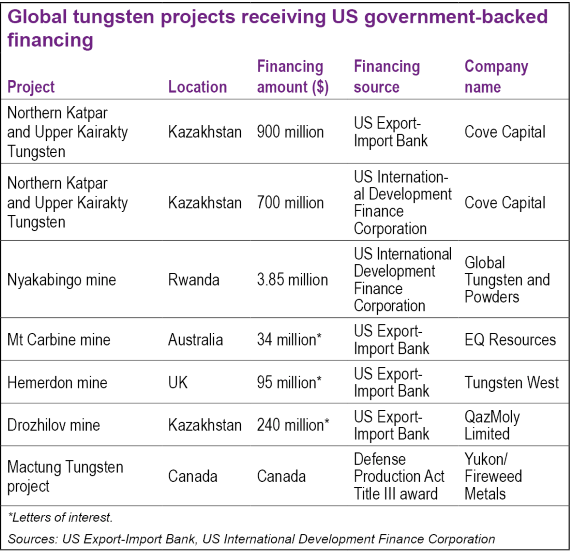 A leading example can be found with Cove Capital, a private equity firm that is developing significant tungsten projects at Northern Katpar and Upper Kairakty in Kazakhstan. EXIM and DFC have together provided most of the project’s funding —EXIM has committed about $900 million in debt financing and the DFC has confirmed $700 million.