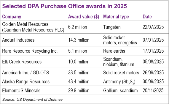 Collectively, the 2025 awards illustrate how the Pentagon’s DPA Purchases Office is strategically utilizing targeted, non-dilutive funding to mitigate risk in early-stage initiatives, expedite feasibility studies and restore processing and manufacturing capabilities for a variety of defense-critical minerals, including tungsten, antimony, gallium, scandium, rare earths and energetics.