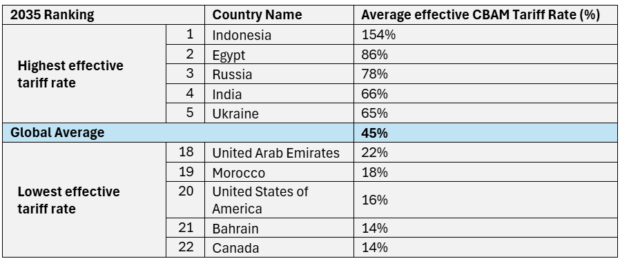 More important for countries’ competitiveness is their effective CBAM tariff rate – that is CBAM costs as a percentage of import value. Default values imply the highest CBAM tariff rates are faced by Indonesia and Egypt, at 154% and 86% respectively, whilst the lowest are faced by Canada and Bahrain3. A country can face a low average effective tariff rate for two reasons: a) they mainly export products to the EU which face lower CBAM costs – in which case they are somewhat shielded from the starkest impacts of CBAM, or b) they have a lower emissions intensity than their competitors – in which case they could stand to gain market share as a result of CBAM.