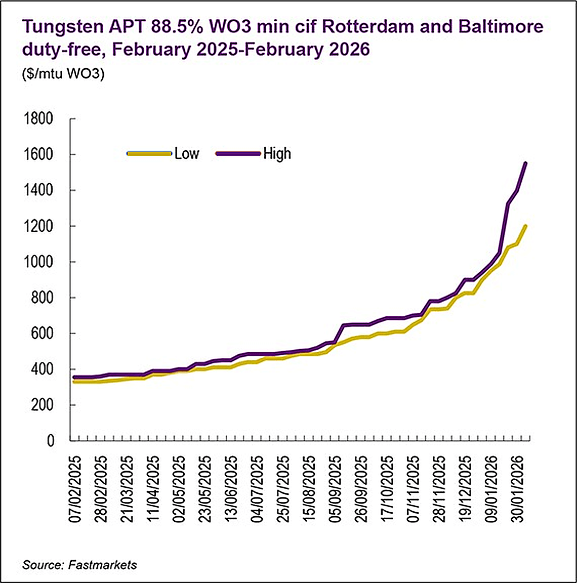 This year alone, Fastmarkets’ price assessments for tungsten APT 88.5% WO3 min cif Rotterdam and Baltimore duty-free have seen huge rises, from the $900-940 per mtu WO3 in January, to $1,650–1,900 per mtu WO3 by mid-February. Even during the traditionally slower Lunar New Year period, market movement continued, with the seaborne APT price as the need to secure units showed little sign of fading.